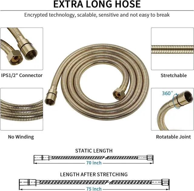 LONG FLEXIBLE STAINLESS STEEL HOSE: This hose can be stretched from 70" to 75", which allows you a longer distance. It' s more convenient for you to shower, bathe your kids, your pets, or clean the toilet