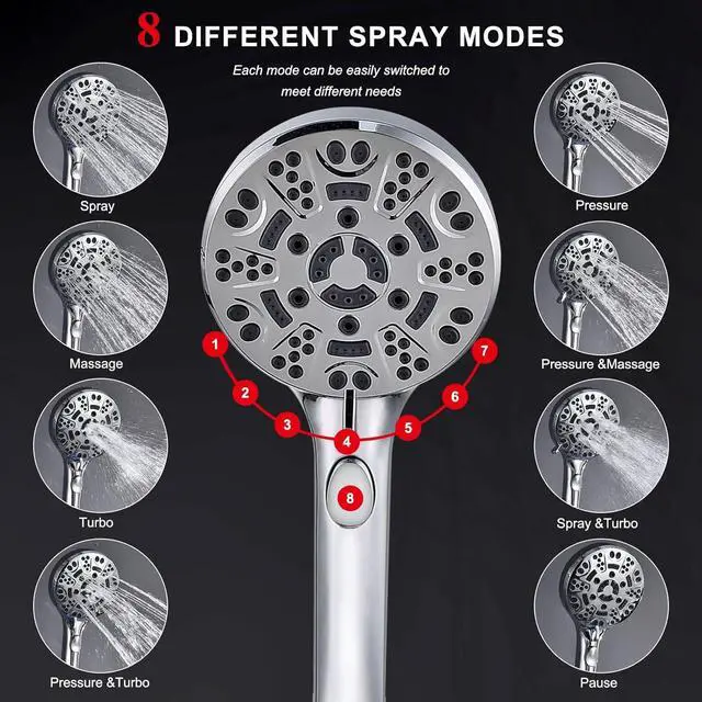 High Pressure 8Sprayer Modes Handheld-BSTGZLUXU Handheld Shower Heads spray has rain shower spraypressure spraymassage sprayturbo sprayrain shower spray &turbo spraypressure spray &turbo spraypressure spray &massage spray and pause water saving spray. Simply turn the controller to select your favorite spray mode. The steady flow and high pressure can fully relax your muscles, relieve fatigue