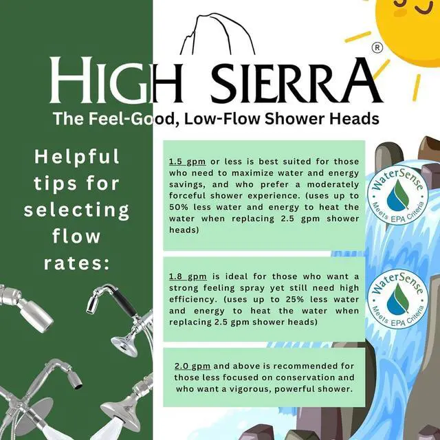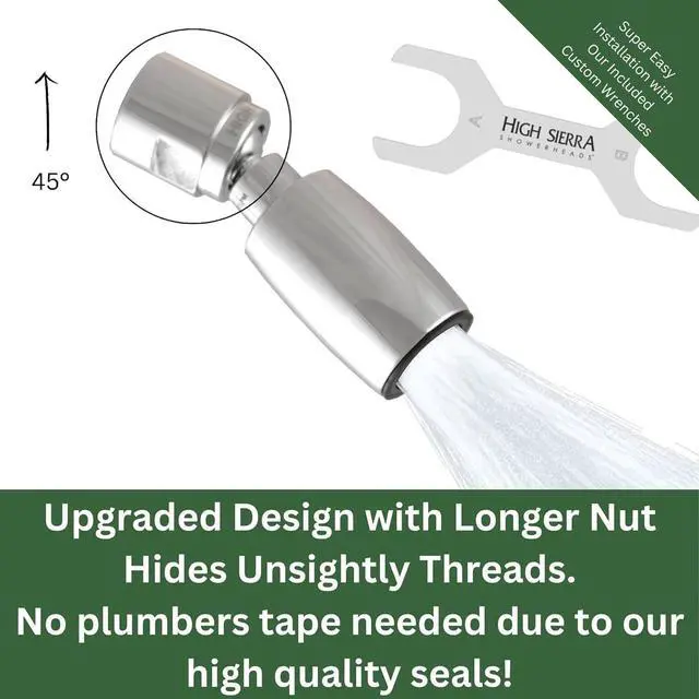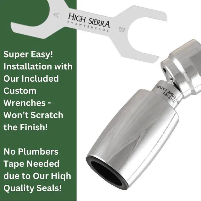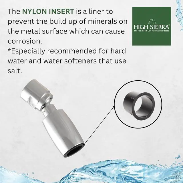 AWARD-WINNING High Sierra' s shower heads work the way that nature does by colliding water to create a rain-like cascade of large, heavy, high-energy droplets. They' re amazing at washing out shampoo, conditioner, and other hair products. New nylon insert protects metal from limescale buildup.