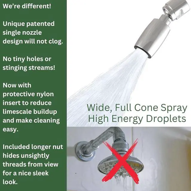 NOZZLE GUARANTEED TO NEVER CLOG Hard water, sand, or rust particles cannot clog the worlds only single nozzle shower head! Solid metal construction. Shower head angle adjusts effortlessly on low friction ball joint swivel.