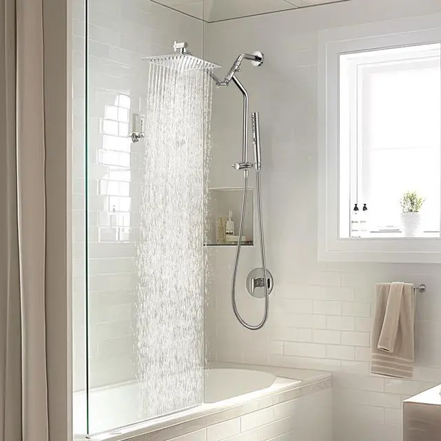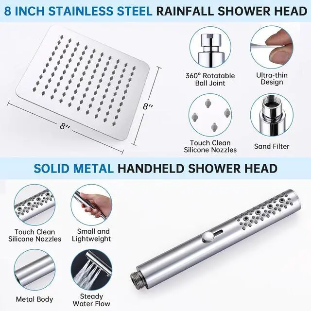 ALL-METAL SHOWER HEAD COMBINATION: Consists of an 8-inch rain showerhead, 3-function hand shower, extended diverter, 9.5 -inch extension arm and 60-inch stainless steel hose. All components are made of high quality all-metal materials to ensure durability. The stainless steel hose is designed to prevent tangles and kinks, giving you the flexibility to move around the bathroom with ease