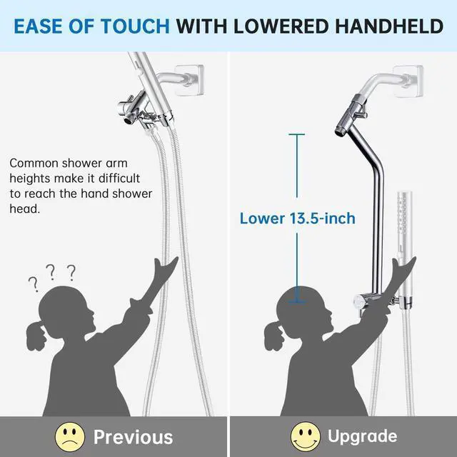 INNOVATIVE DIVERTER DESIGN: Compared with the traditional shower diverter, this diverter allows you to easily adjust the mode with a single reach, and the 13.5 " lowered design of the handheld bracket also allows you to reach the hand shower head easily. With the 9.5 -inch extension arm, the showering experience is more comfortable without having to worry about overlapping water flow. Family members of different heights and people with reduced mobility can also enjoy the shower more conveniently