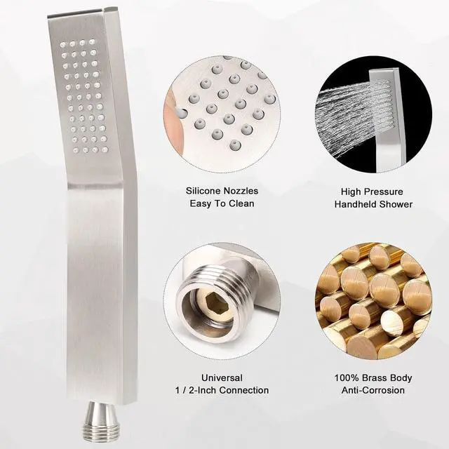 BRASS CONSTRUCTION: NearMoon Hand shower head body made from solid brass ensures long lasting durability. The modern bent L-shaped design makes handheld shower head turn into a convenient tool for bathtubs or shower.
