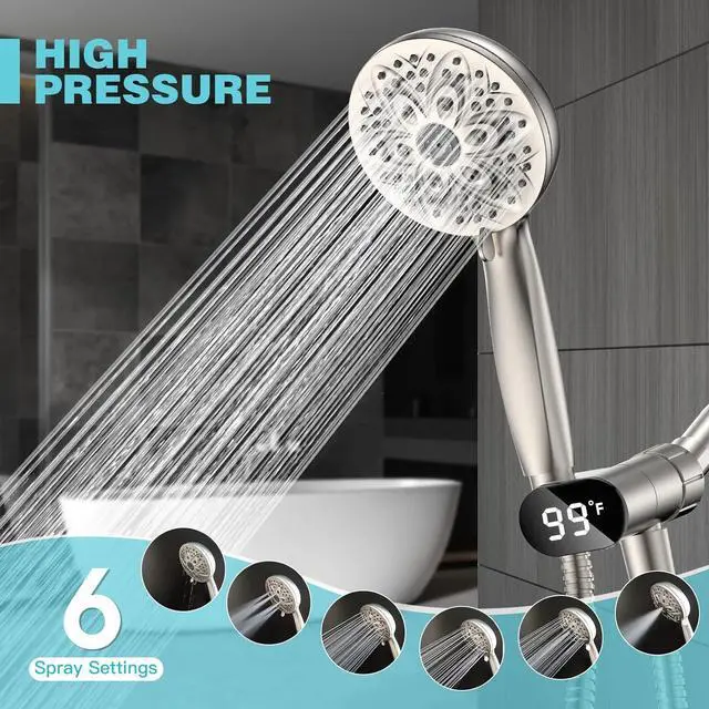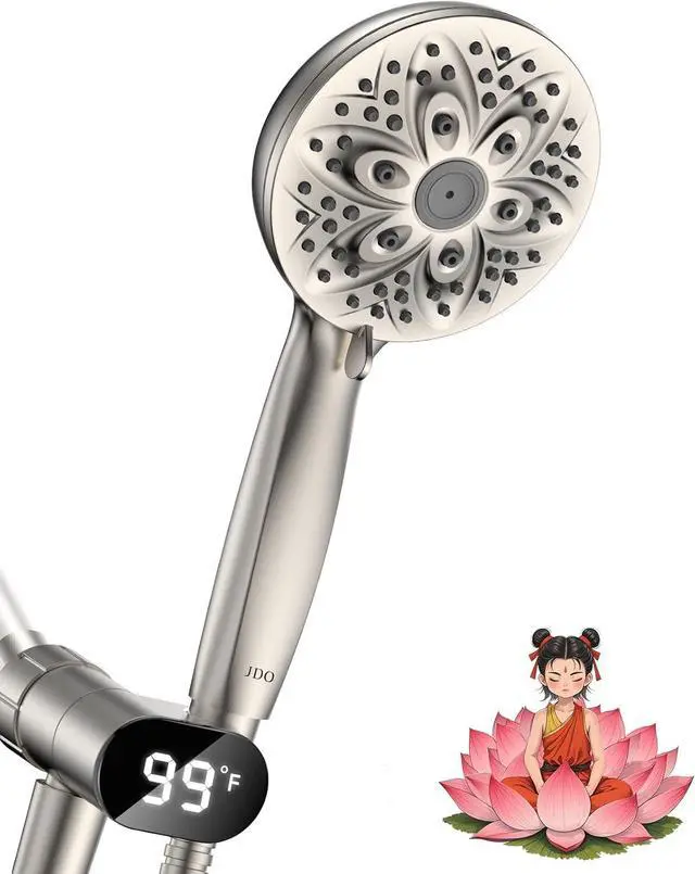 LED Display Temperature You're still relying on the feel of your hand to determine the water temperature, which can take some time to get used to and adjust the water temperature, and we're 2024 introducing our newest shower head with a temperature display. The numbers on the display give you an idea of the water temperature, which allows you to adjust the water temperature more quickly and accurately, improving ease of use and comfort. Ideal for bathing babies and pets. 6 Different Shower Modes The Lotus Design Inspired by Nezhas Rebirth newest handheld shower head with hose has six modes that can be switched at will, such as massage, rain, spray, and water-saving modes, each of which has a different water flow pattern and intensity.
