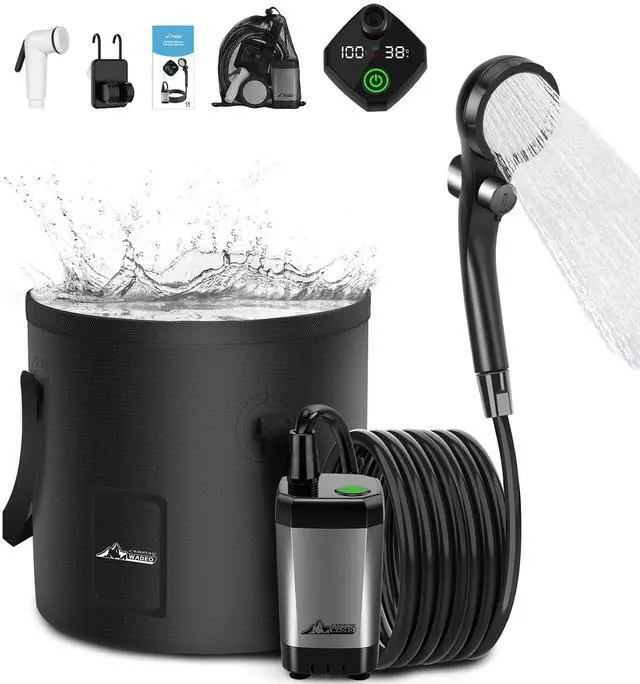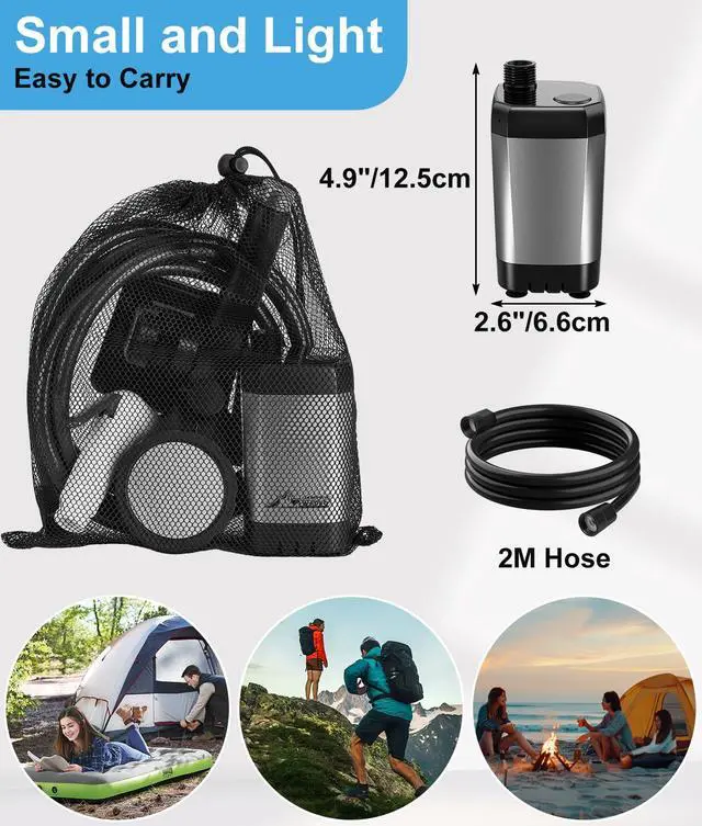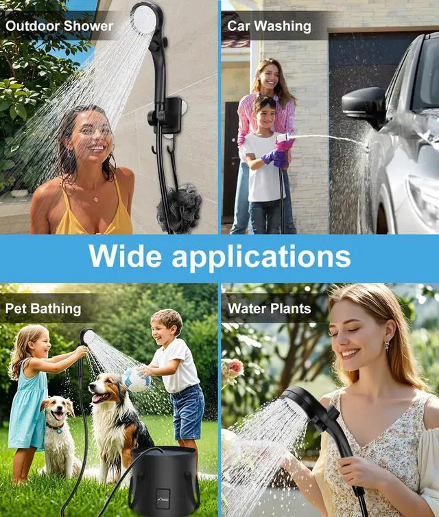 | Included Components | 1 X Camping Shower Pump, 1 X Camping Shower Head, 1 X Camping Shower Nozzle, 1 X 6.5 ft (2m) Hose, 1 X Type-C Charging Cable (NO adapter), 1 X Shower Head Holder, 1 X 3-in-1 Hooks, 1 X 20L Collapsible Bucket |