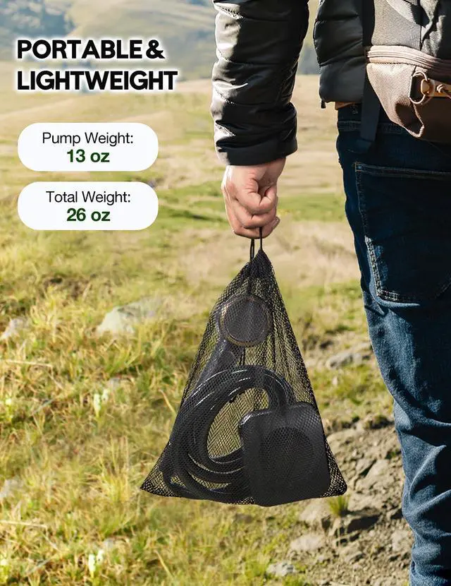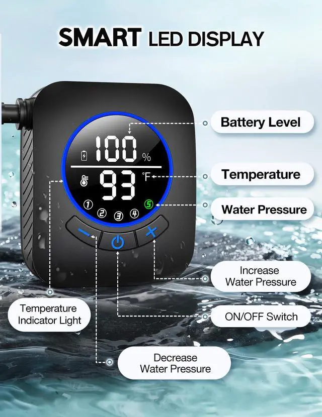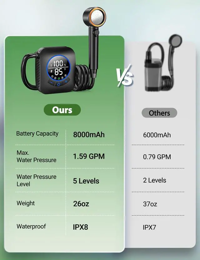 | Included Components | 1× Storage Mesh Bag, 1× Type-C Charging Cable, 2× Rubber RingOne Pre-Installed on the Hose and a Spare, Camping Shower Kit: Includes 1× Portable Shower Head, 1× Portable Shower Pump, and 1× Portable Shower Hose, Shower Holder: Comes with 3× Suction Cup and 2× Hook |