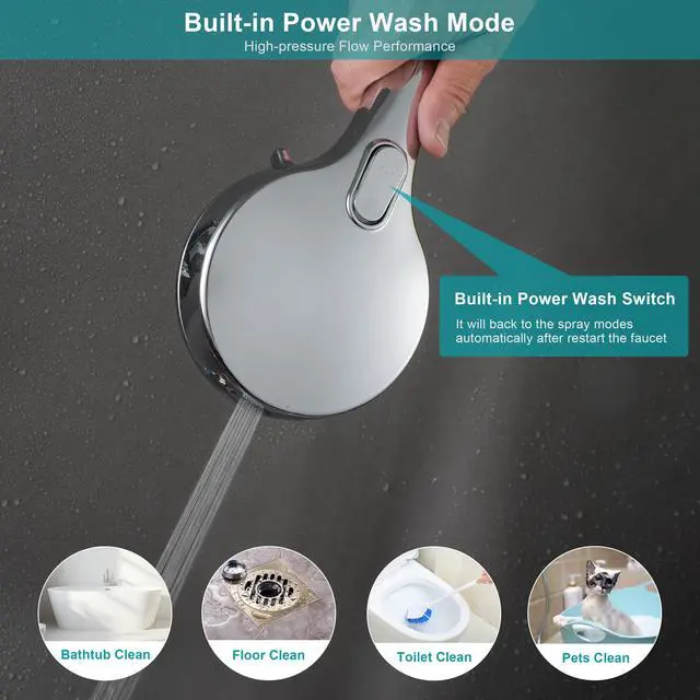 Press it to clean the unwanted residue or lost hair on your tub or tiles. Besides, 79inch shower hose will help to reach each corners of bathroom or clean the pets. It will back to the shower spray modes automatically after restart the faucet.
