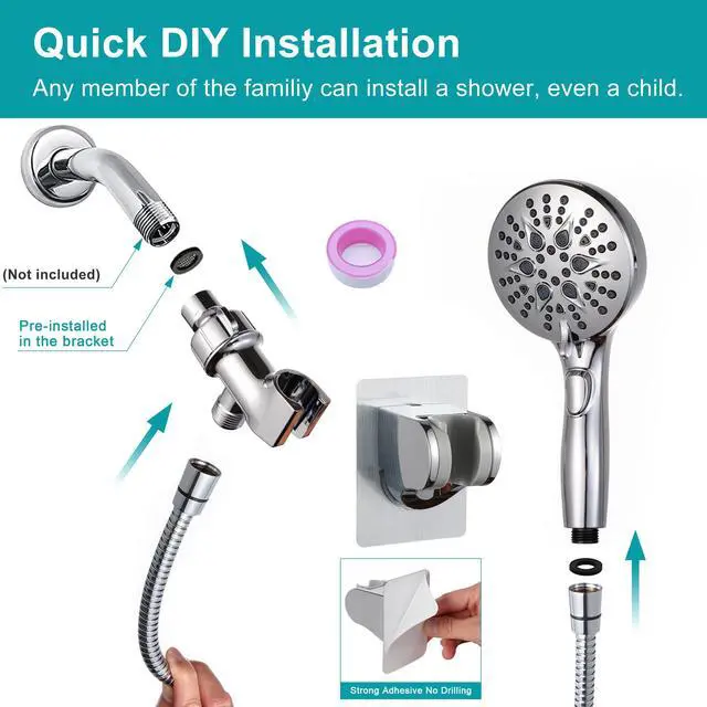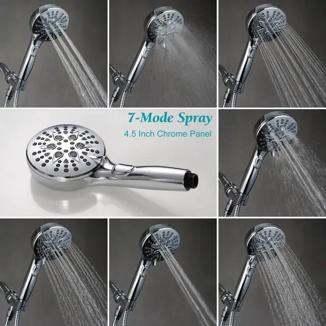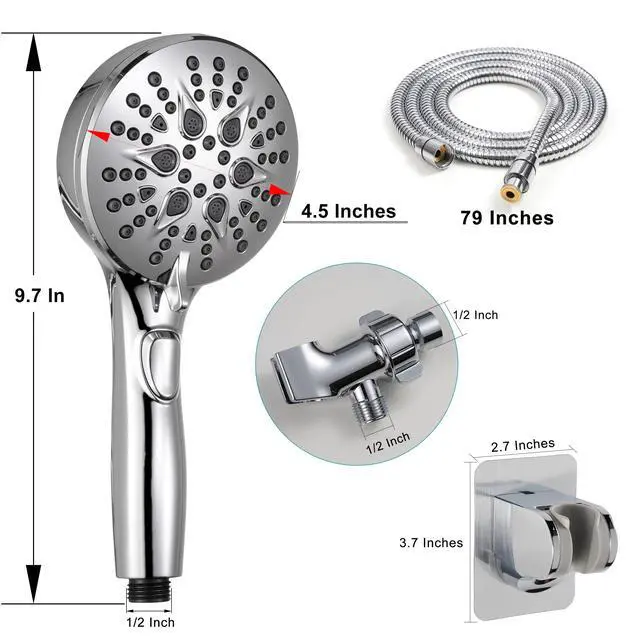 The bathroom handheld showerhead features 7 spray modes , as well as the powerful wash and stop button. The shower set includes the 4.5in spray head,Long 79inch stainless steel shower hose, adjustable overhead bracket, low-reach adhesive shower holder and accessories.