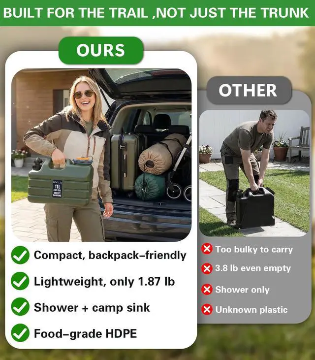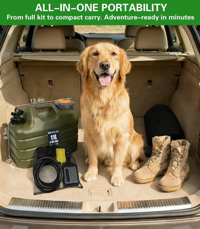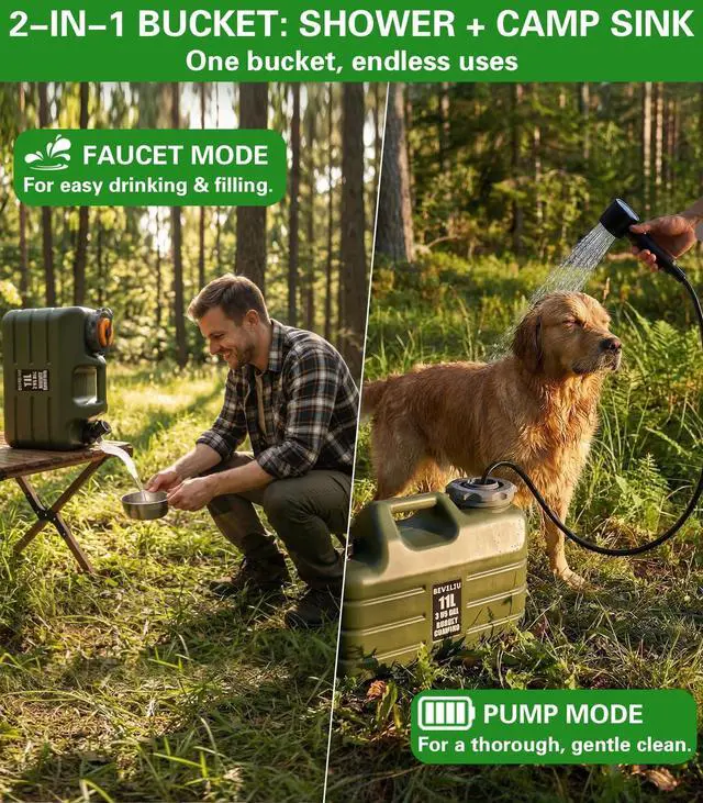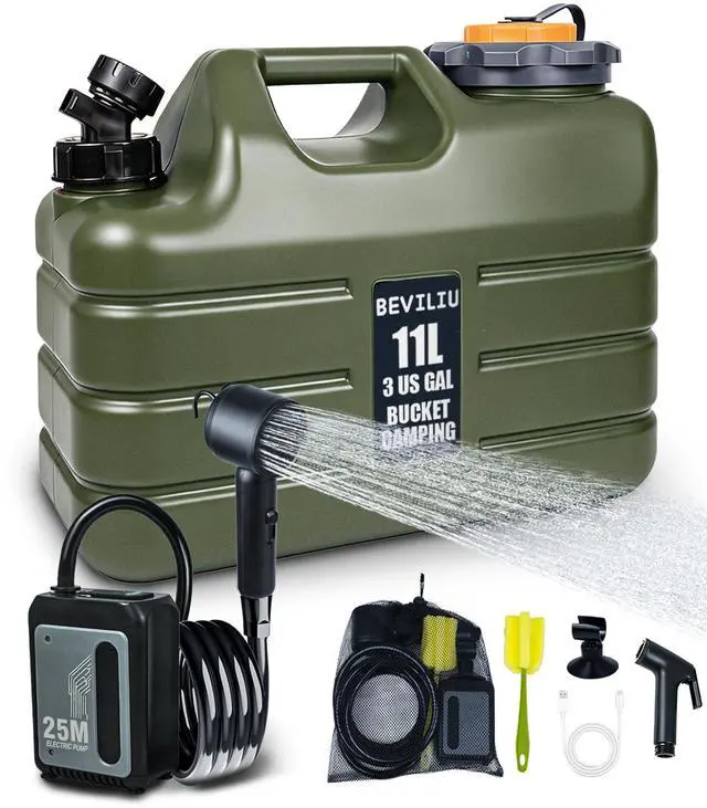 The Beviliu Portable Camping Shower brings a refreshing rinse to your outdoor adventures. It features a powerful 4000mAh rechargeable pump paired with a rugged 3-gallon food-grade HDPE tank. The dual-opening design adds versatility: the large sealed lid prevents spills during pumping, while the small faucet-style opening allows hose attachment for easy dispensingperfect for hand washing, filling bottles, or camp chores. The tank is built tough and can also serve as reliable emergency water storage. The IPX8 waterproof pump delivers steady pressure for 6080 minutes on a full charge. Lightweight and compact, it packs easily into your car, backpack, or RV. Ideal for rinsing off after a hike, washing your dog, cleaning gear, or even car wash duty at remote trailheads. Built to last and easy to useyour go-to shower for camping, road trips, and life outdoors.