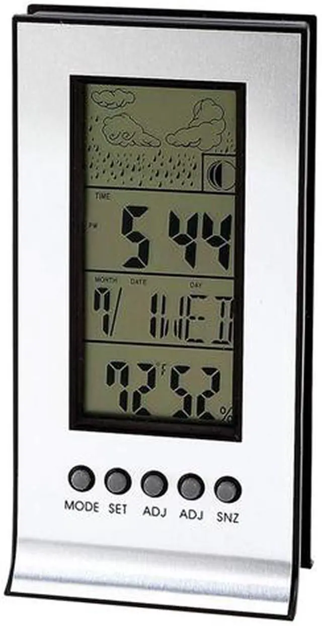 Features temperature in Fahrenheit and Celsius from -58 degreesF to 158 degreesF, humidity from 20% to 99%, weather forecast, 12/24hr clock with alarm and snooze, calendar with day, week, month, year, and lunar phase. One LR1130 battery included. Measures 2-1/8" x 4-1/4" x 1-1/8". Gift boxed.