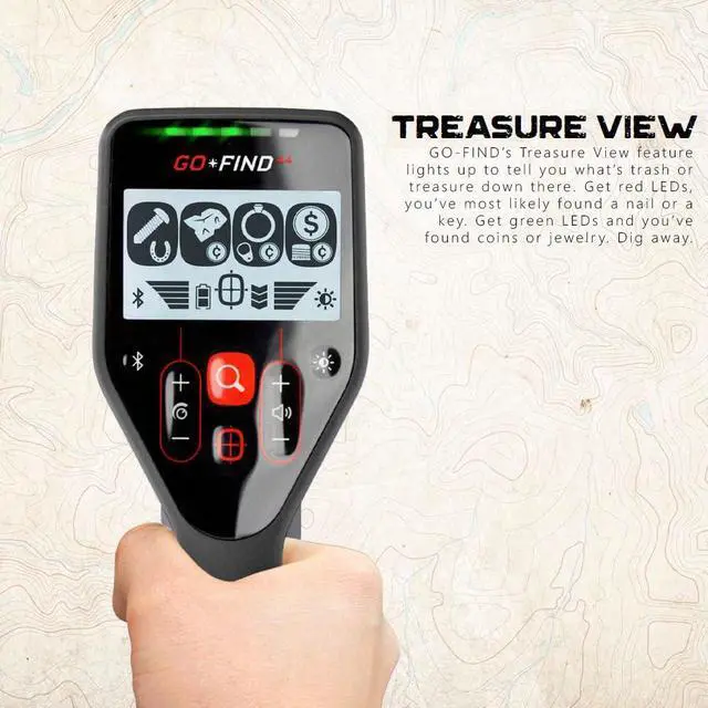 GO-FIND’s Treasure View feature lights up to tell you what’s trash or treasure down there. Get red LEDs, you’ve most likely found a nail or a key. Get green LEDs and you’ve found coins or jewelry. Dig away.