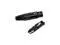 This DMX connector is made of black, anodized aluminum with a plastic cap, rubber strain relief boot, and lock release button. It features three solder cup connectors for the conductors and a solder post connector for the shield. This connector is designed for use with 4-Conductor DMX Lighting Bulk Cable.