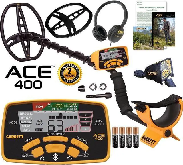 Sound Headphones - In-line volume control Rotating earpieces for easy packing. It's 41" coiled cord extends to 82". Garrett ACE Environmental Cover Up - Protect your metal detector's control box against mud and bad weather. Also Includes Garrett 8.5" x 11" PROformance DD Waterproof Submersible Search Coil - DD configuration provides greater detection depth and performance by significantly reducing the negative effects of heavily mineralized ground and saltwater interference. Adjustable Arm Strap - Holds detector tight tight to your arm for increased stability. Garrett ACE 400 Instruction Manual - Instruction Manual to help assemble, take care of and learn how to operate your metal detector. Garrett Search Coil Hardware Kit includes Bolt, Washers and Nut - This kit includes the nut, bolt and washers that hold the search coil to the lower pole of your Garrett Metal Detector. 4 "AA" Batteries Included - Power your ACE 400 right out of the box. FREE Garrett Catalog! - We include a FREE Garrett Buyers guide (While supplies last, Garrett may have new buyer's guides coming out that do not exactly match the picture). Exclusive 2 Year Warranty - Garrett warrants that each piece of its detection equipment is protected by a limited parts and labor warranty for a period of 24 months from the date of purchase.