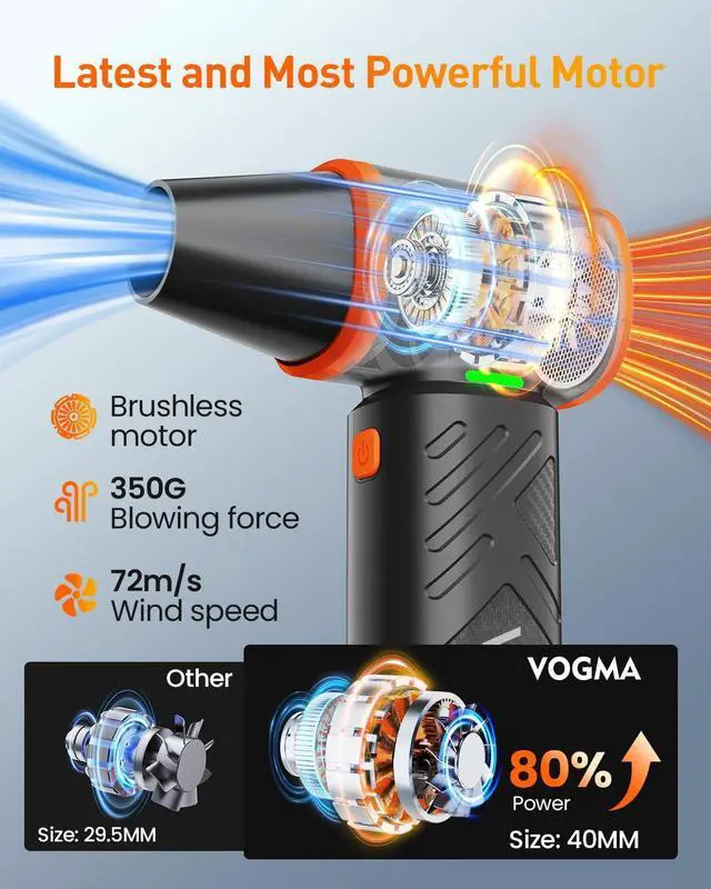 Upgraded Powerful Brushless Motor: The VOGMA V40 compressed air duster can deliver impressive speeds up to 270,000 RPM, generating a maximum wind speed of 72 m/s and an ultra-strong wind pressure of 350G. 80% more powerful than ordinary air duster. The stepless adjustable electric air duster can effectively remove dust and debris. It can easily handle all kinds of cleaning tasks.