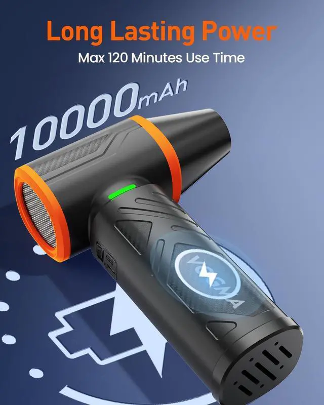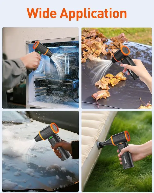 Multi-Functional Cleaning Tool: The VOGMA air duster has 5 nozzles, 1 brush, a pair of earplugs and a storage bag. Which is perfect for cleaning keyboards, computers, air conditioning vents, car window blades, rearview mirrors, sofa crumbs, drying pet hair, blowing snow off the car. It's also great for inflatable gear or managing a campfire, making it an essential tool for multiple scenarios.