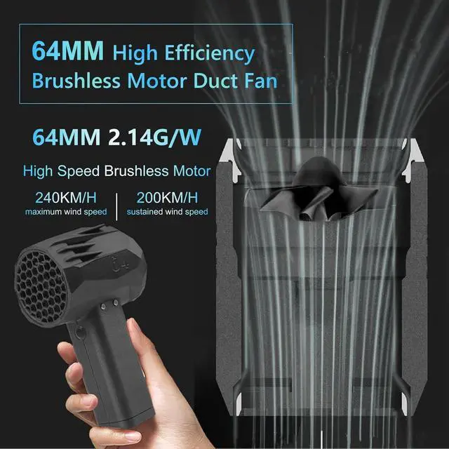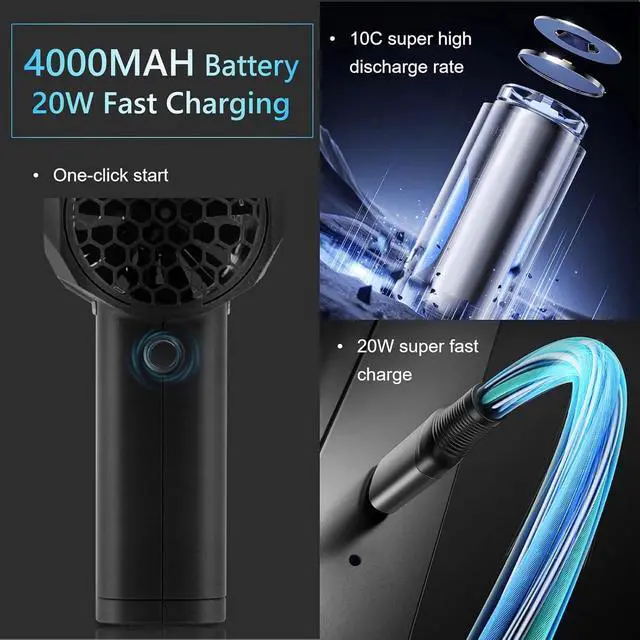 HIGH SPEED BRUSHLESS MOTOR: This compressed air duster uses a high-speed brushless motor with excellent dust removal effect, scientific darkening design, thrust up to 4.9 lbs (1,400 g), wind speed up to 240 km/h, 10C super fast discharge, high performance 59,200 MWH ultra-large capacity battery, 20 W ultra-fast charging