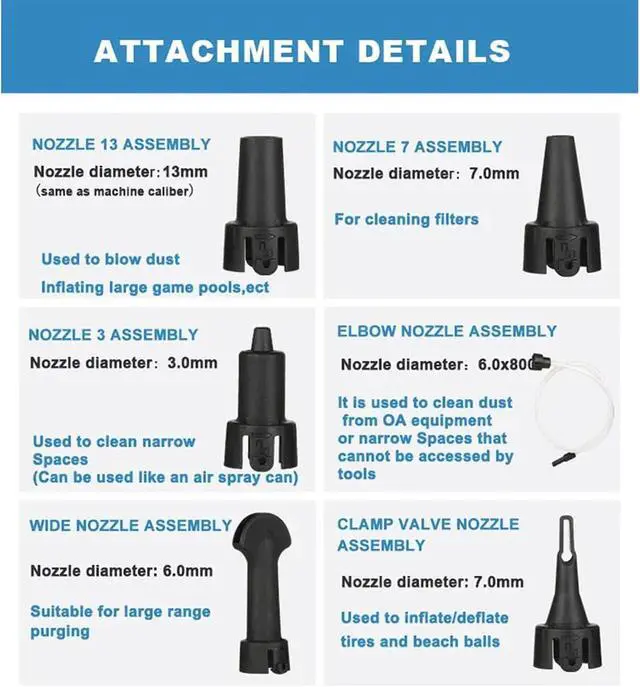 Versatile Nozzle Collection: Get ready to conquer every cleaning challenge with an arsenal of 6 different nozzles. Each nozzle is meticulously designed to tackle different cleaning scenarios like homes, keyboards, air conditioners, computer cases, offices, cars and more. From intricate crevices to wide surfaces, the electronic canned computer air can is your ultimate cleaning sidekick. Plus, this laptop dust blower doubles as a magician, effortlessly inflating your pool toys, air mattresses.