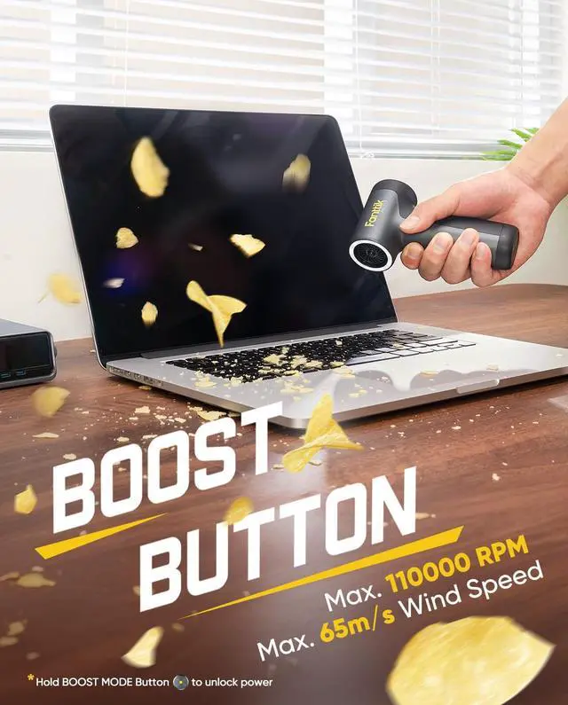 [B10 Pro] Powerful Performance: This cordless air duster uses a brushless motor, fan blades and airflow channel with three speeds. Switch to boost mode and the air blower duster hits 110000 RPM, 65 m/s. As a dust blower, it clears desks and keyboards with ease