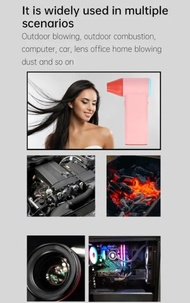 VERSATILE USAGE: This tiny air blower is ideal for dusting keyboards and computers, outdoor fire blowing and leaf blowing, drying human and pet hair, cleaning car interior dust, removing snow covering cars, blowing rain off car mirrors, inflating air cushions, blowing up balloons, serving as a fan to cool down, and more.