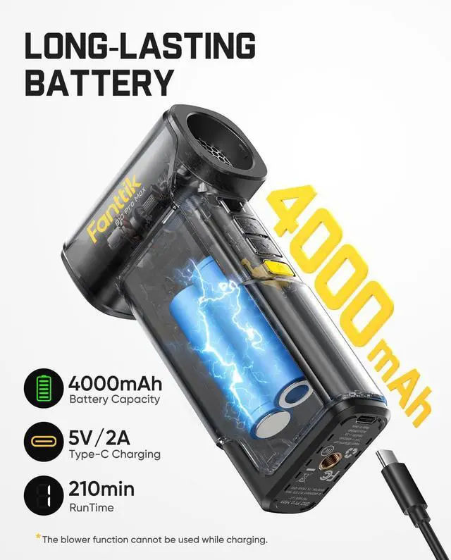 [B10 Pro Max] Long-Lasting Battery: With built-in 2x 4000 mAh lithium batteries, this battery duster tool delivers up to 210 minutes of run time on every charge. Equipped with Type-C, it also doubles as a little backup power bank (28.8Wh), to charge electronic devices when used outdoors