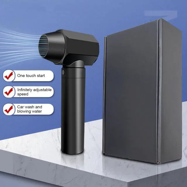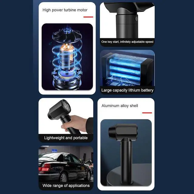 Multifunctional: Powerful air blower, fast drying space, efficient cleaning debris, adjustable speed. Suitable for washing and dusting cars, blowing snow and de icing, quick action, portable The turbocharged air system gathers strong wind force and sprays out high speed airflow, bringing an incredible cooling experience. A good choice for travel gifts.