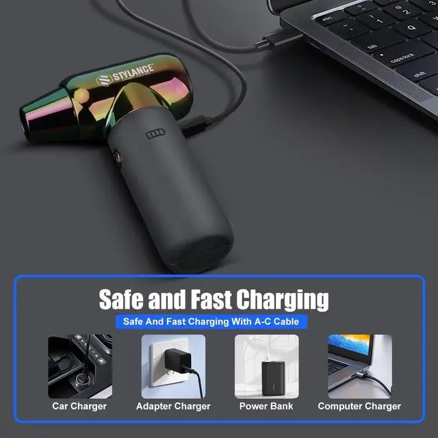 Long-lasting battery & Type-C chargingThe Electric Air Duster features a large 2500mAh battery with three adjustable speed levels.In the low-speed setting at 60,000 RPM,it provides a battery life of 100 minutes.The medium-speed setting at 100,000 RPM offers a 70-minute battery life,and in the high-speed setting of 120,000 RPM,it lasts for 20 minutes.With the included Type-C fast charging cable,it can be fully charged within 2.5 hours.