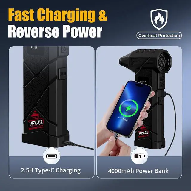100-Level Stepless Speed Control: Adjust airflow precisely with 100 smooth speed levels from gentle cleaning for keyboards and electronics to turbo airflow for heavy-duty dust removal, outdoor blowing, and multipurpose use.