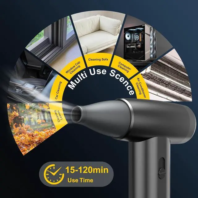 [Superior Battery Life]: Equipped with a high-capacity 6000mAh battery, this mini electric compressed air blower can run continuously for 120 minutes on a single charge. It comes with a USB-C fast charging cable and can be charged by a computer, mobile power supply, car charger, or adapter. The electronic air blower/air duster is gear replacement for canned air, and it's energy savings and Eco-Friendly.