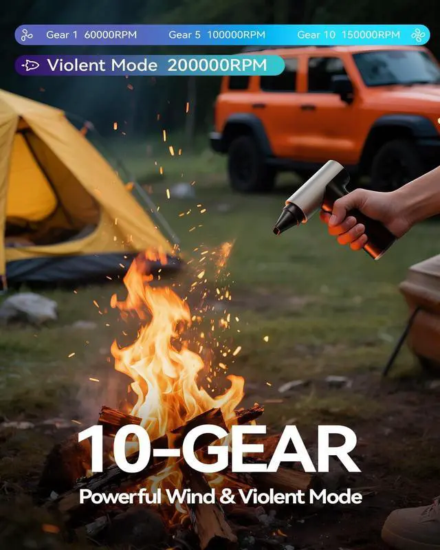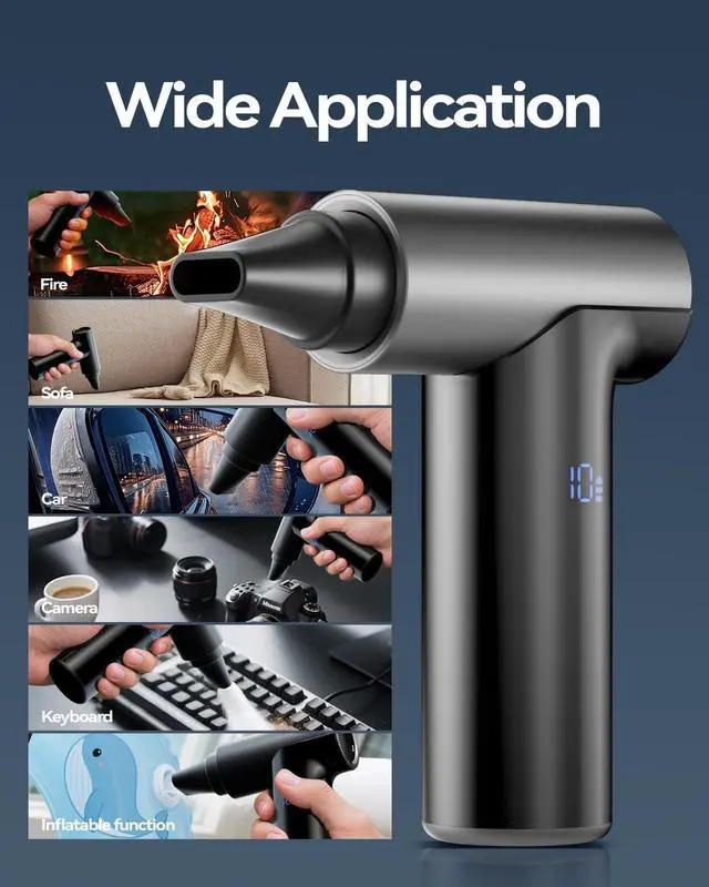 Multi-Scene Essential: Comes with 4 nozzles for targeted cleaning, our electric air duster can effortlessly tackle electronics (PCs, keyboards), home spaces, car interiors, and outdoor gear. Beyond dusting, it also works for inflating equipment and managing campfires, making it a versatile must-have for daily use and adventures.