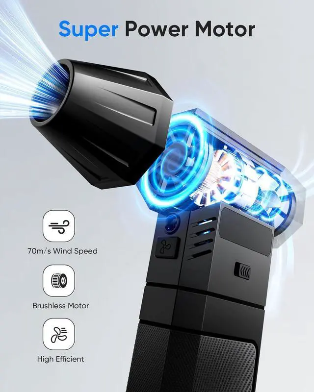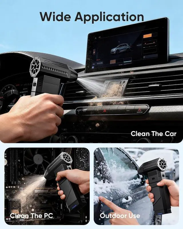 Magnetic Nozzles + LED Light Clean Smarter in Every Detail Includes 2 quick-snap magnetic nozzles: pinpoint jet tip and wide-angle cone. Combined with the integrated LED spotlight, youll tackle crumbs in crevices, dust under keyboards, or leaves in car grillseven in total darkness. Ideal as a keyboard air duster, handheld air blower, or jet blower car dryer.