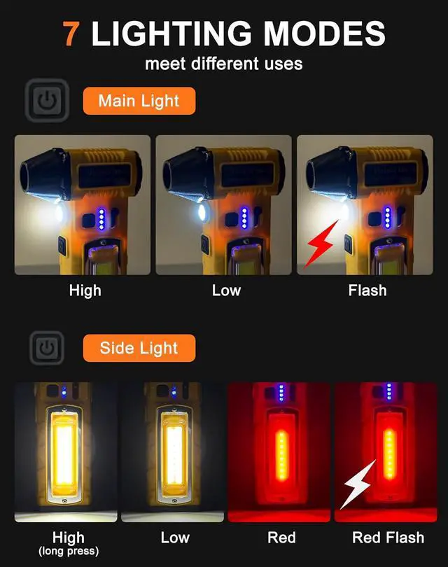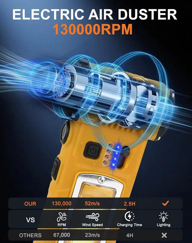 BRIGHT LED ILLUMINATION: This electric air duster features both a built-in LED main light and COB side lighting that brightly illuminates dark, hard-to-access areas, helping you clearly see and remove hidden dust and debris. To turn the sidelight on, simply long-press the switch button. The main light supplies 3 light modes and the side light supplies 4 light modes, which can adapt to different scenes.