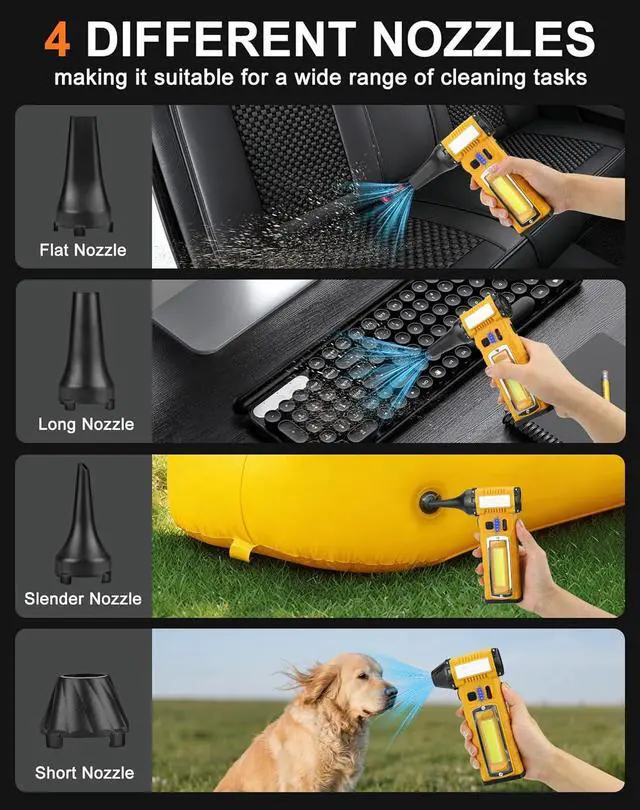 VERSATILE USE: The Minsk compressed air duster offers 4 interchangeable nozzles in different sizes, making it suitable for a wide range of cleaning tasks. It can be used to clean keyboards, air conditioner vents, car interiors, electronics, and other delicate items. Beyond dust removal, it also supports inflating objects and can even serve as a mini cooling fan when needed.