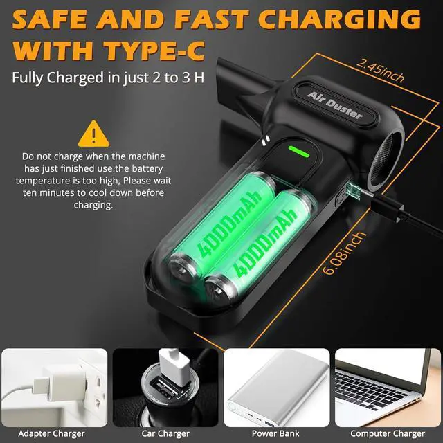 Fast USB-C Charging & Smart Safety Protection FeaturingUSB-C fast charging, the Gardon air duster fully recharges in just23 hoursvia power bank, laptop, car charger, or wall adapter. It includes comprehensive safety features:auto shut-off after 5 minutes, plus protection againstover-charging, over-voltage, overheating, and short circuits. Energy-efficient and eco-friendly, its a sustainable alternative to disposable canned air