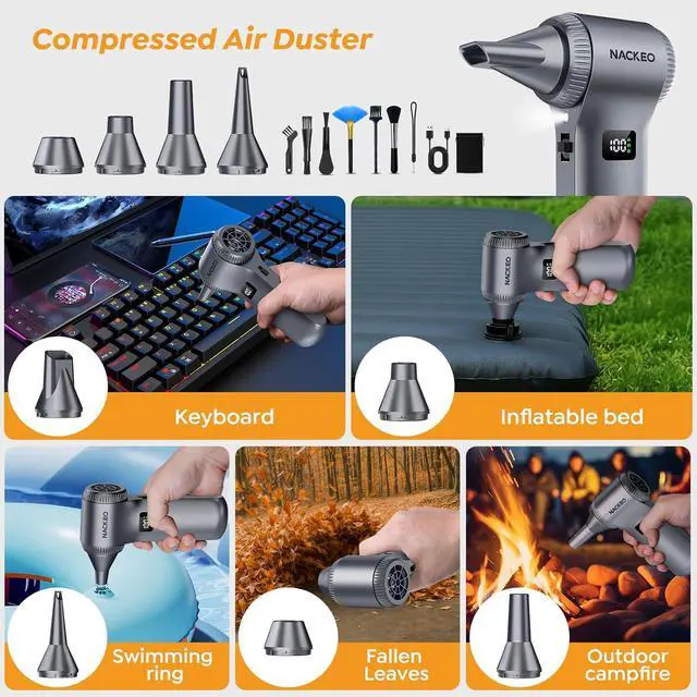 Inflation-Expand Usage ScenariosCompressed air duster is equipped with five nozzles and six brushes, which can easily sweep away dust by matching different brushes and nozzles.At the same time, its inflation function further expands its use scenarios. In outdoor scenes, it can also easily inflate swimming rings, inflatable beds, etc. You can inflate the swimming ring at any time in the hot summer so that you can cool down in the pool at any time, or you can inflate the inflatable bed at the campsite so that you can lie down comfortably.