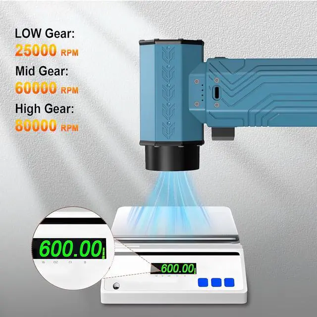 Smart Speed Control & Precise Handling Features smooth stepless speed adjustment (25,000 RPM~80,000 RPM), freely switching from a gentle breeze to a violent hurricane to meet diverse cleaning needs with effortless control.