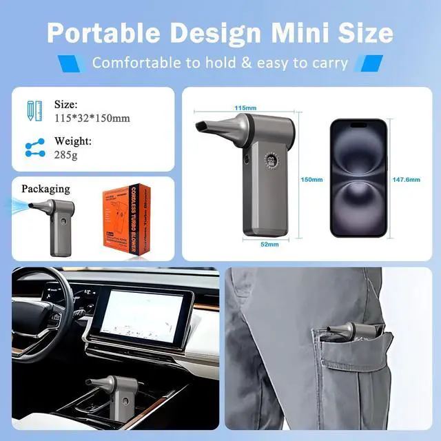 Ultra Compact & Portable Mini Air BlowerWeighs just 0.7 lbsSmall size and light weight to slip into your toolbox, tote bag, or even your pocket. Take it anywhere effortlessly for on-the-go cleaning needs without taking up too much space.