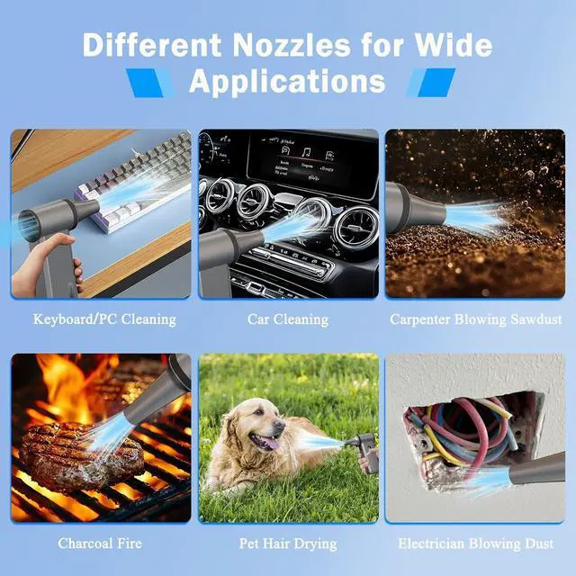 1-Hour Full Charge & Long-Lasting Battery The compressed air duster supports 45W USB-C SuperFast Charging, so you can fully charge the dust blower from 0-100% in just 1 hour. Powered by a high-capacity 2×4000 mAh lithium batteries (29.6 Wh), this rechargeable air duster delivers extended runtime perfect for diverse tasks: quickly dusting home office electronics, blowing away woodworking debris, clearing workshop dust. Tip: For best performance, fully charge before first use.