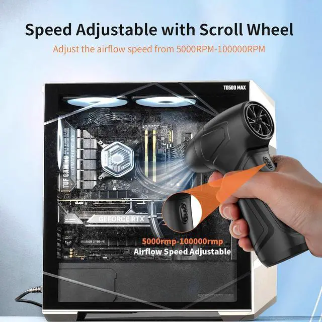 Scroll Wheel Speed Adjustment - This high-performance electric dust blower is equipped with a 100,000 RPM motor, allowing you to smoothly adjust the airflow speed from 5,000 to 100,000 RPM using the scroll wheeleliminating gear limitations. The cordless leaf blower delivers a strong 160 g air pressure and a peak wind speed exceeding 56 m/s for efficient cleaning.