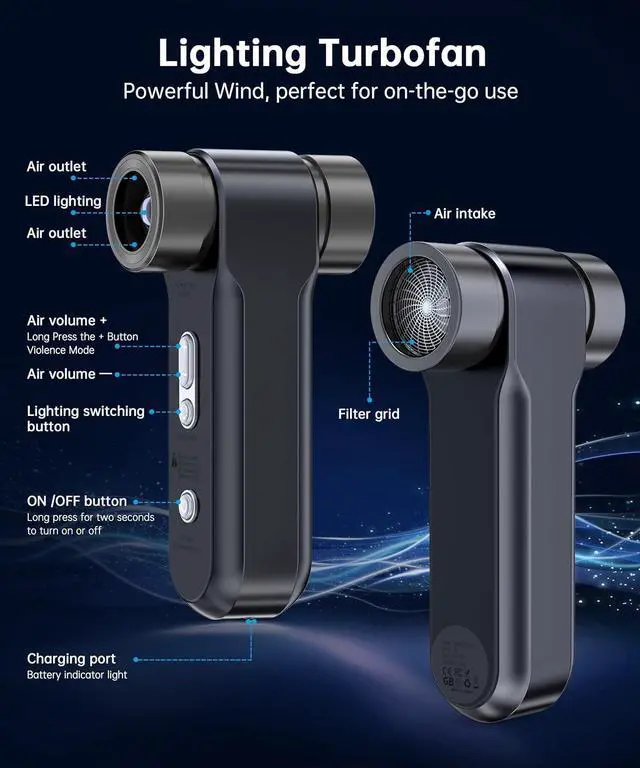 Multi-Function Dust Cleaner Built-in Flashlight:Beyond just cleaning, our electric duster excels in various applications.Our multi - functional turbo air blower doubles as a flashlight with two modes - bright and SOS. Its can illuminat up to 100 meters,offers 3 - hour lighting runtime and 4 - hour SOS signal, ensuring visibility in darkness and helping handle emergencies.