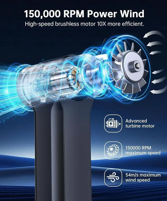 Stepless Speed Control Super Power Turbo Fan:Traditional air dusters have 3 gearsthis 2025 upgraded air blower boasts stepless speed control.Compressed air duster offers stepless speed control wind speed with 54 m/s,and 200g thrust at full power. You can freely switch the wind speed to clean PC, keyboards, falling leaves,snow and causing no harm to your objects.