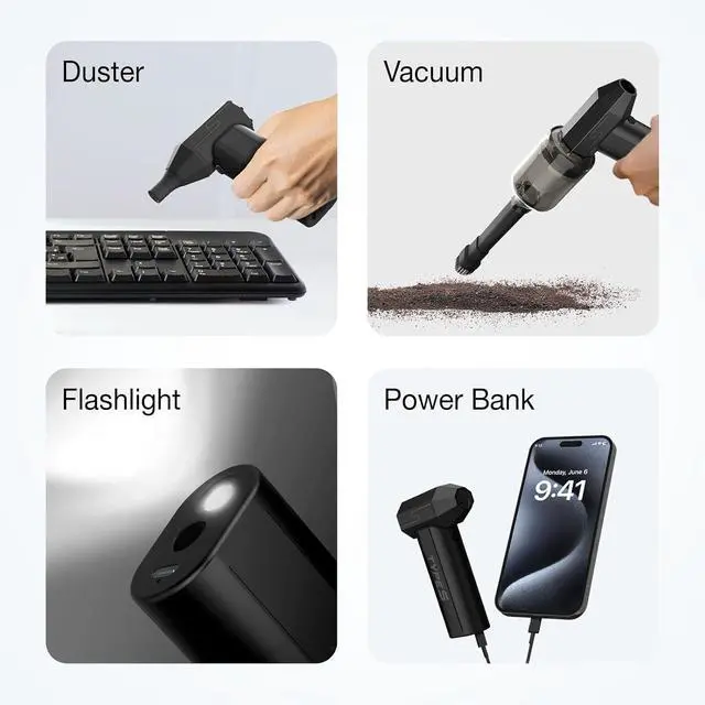 4-in-1 Multi-Function Cleaning Power Combines electric air duster, vacuum, LED flashlight, and power bank into one compact device for ultimate convenience in home, office, and automotive cleaning.