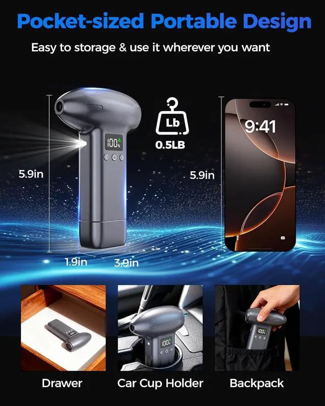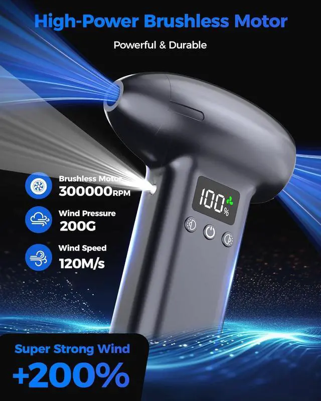 • Ultra-High Speed 300,000 RPM Motor The compressed electric air duster features the latest powerful motor technology with an upgraded 300,000 RPM brushless motor that delivers a blowing force of 200G and a maximum wind speed 120m/s.This electric air duster can effectively remove dust and debris from electronics, keyboards,computers,PC cases,cars and crevices,helping you clean every corner easily.This rechargeable electric blower replaces disposable compressed air cans with an eco-friendly solution.