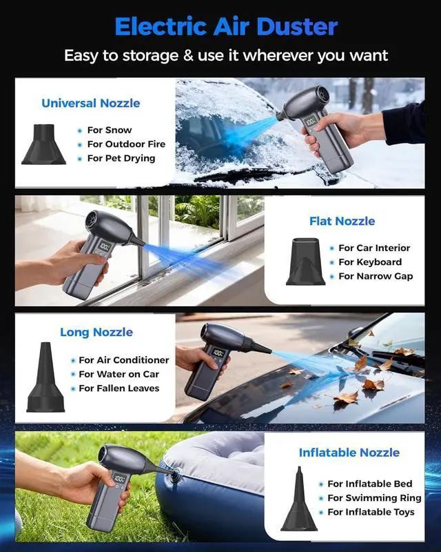 • 3-Gear Adjustability & Multi-Scene EssentialFeaturing 3 gear options,this cordless electric air duster is versatile and customizable for different cleaning needs. Featuring 4 nozzles and 2 brushes,this turbo jet blower offers precise control to match any cleaning task.Such aselectronics cleaning(computers keyboards and chassis,cameras andlaptops),home cleaning(pet hair,doorstep snow,car seats),outdoor inflation and suction (balloon, air mattress,vacuum storage bed,campfires