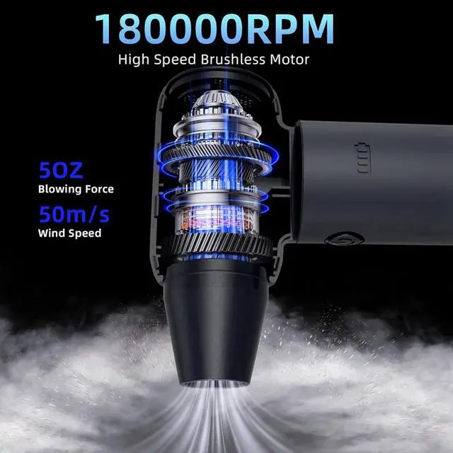 High-Speed Brushless Motor: Experience unparalleled cleaning efficiency with our air duster equipped with a cutting-edge 180,000 RPM motor. Generate winds up to 50m/s and a formidable 5OZ of wind force to tackle dust, rain, and snow on various surfaces effortlessly.