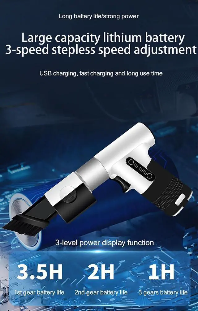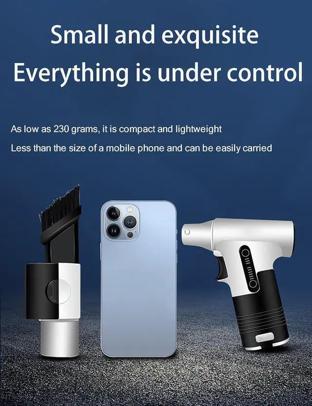 Brushless motor: 120,000 rpm high-speed jet dust collector, which can provide surging blowing/suction power, strong wind power, one-button switch, simple and convenient operation, and perfect dust removal effect. The wind speed can reach 33M/S, and the motor power can reach 40W.