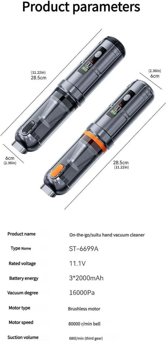 powerful 16000Pa suction with the brushless motor car delivering 80,000RPM to remove debris like pebbles, and crumbs in seconds