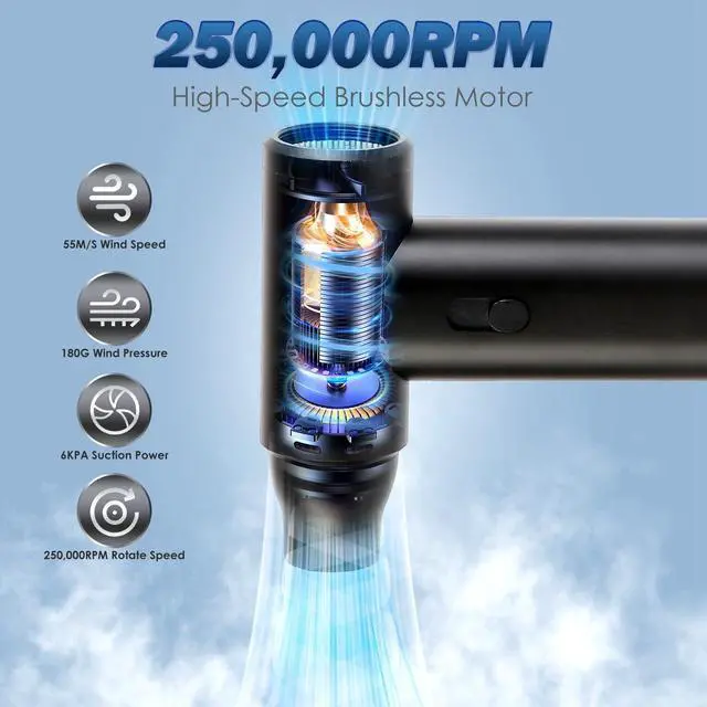 Powerful CleaningThe cordless electric dust collector can reach a speed of up to 2500000RPM, with a peak wind speed of more than 55M/S. The super strong airflow can remove debris and dust from any gap. In addition, the sliding switch allows you to customize the airflow according to different cleaning needs, and long press the power to turn the air dust collector on and off