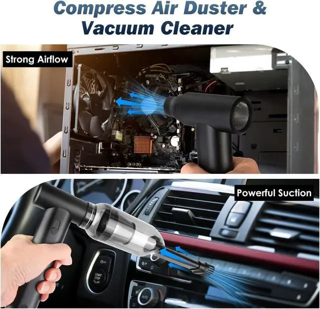 Compressed air dusterThe front end of this air duster is used to blow away dust and debris, and the powerful airflow ensures effective dust removal. The rear end is used for dust suction and extraction, so this multifunctional air duster can be used not only for dust removal, but also as a vacuum cleaner and blower. In addition, The powerful brushless motor effectively improves the cleaning effect and service life, avoids overload, overheating, overvoltage, short circuit, and leaves no place for dust to stay