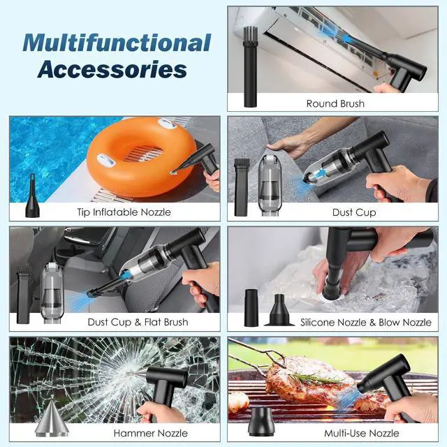 18Pcs Multi-Purpose AccessoriesThe compressed air dust collector is equipped with nozzles and cleaning brush sets for different purposes, with a total of 18 accessories. The multi-functional accessories are very suitable for daily life use, which can clean dust and impurities in electronic devices, desks, furniture, and cars, making the target items look brand new. You can vacuum storage, clean hair, blow barbecue charcoal or inflate swimming rings, etc. A full range of accessories and tools to suit any job