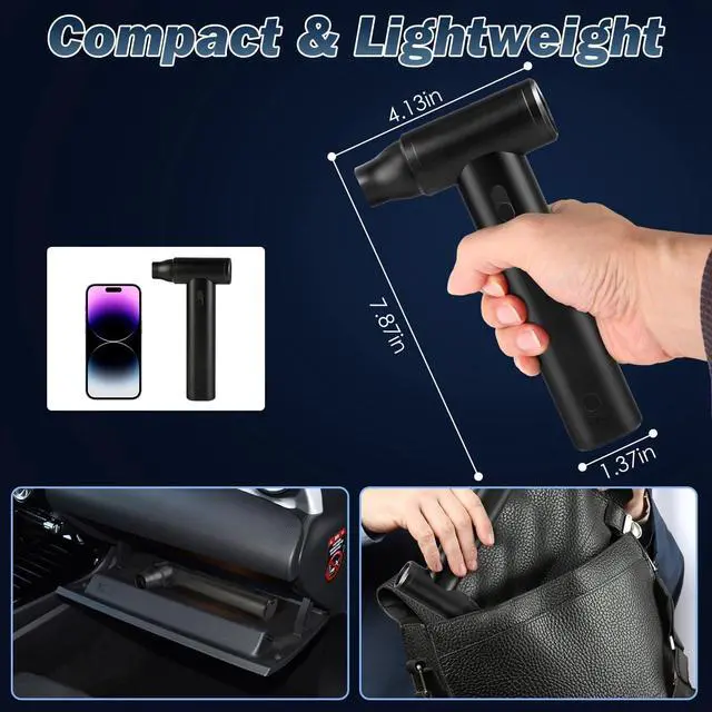 Handy DesignThe dust blower is made of solid aluminum alloy, which is tight and wear-resistant, and the body is comfortable to hold. With wireless and compact design, light weight and small size, it is easy to carry and store, it is a perfect choice for various jobs such as home, office, car, outdoor, etc